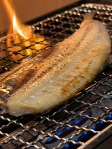 各卓に炉端焼きのカセットコンロが置いてあり、店員さんが目の前で焼いてくれる。